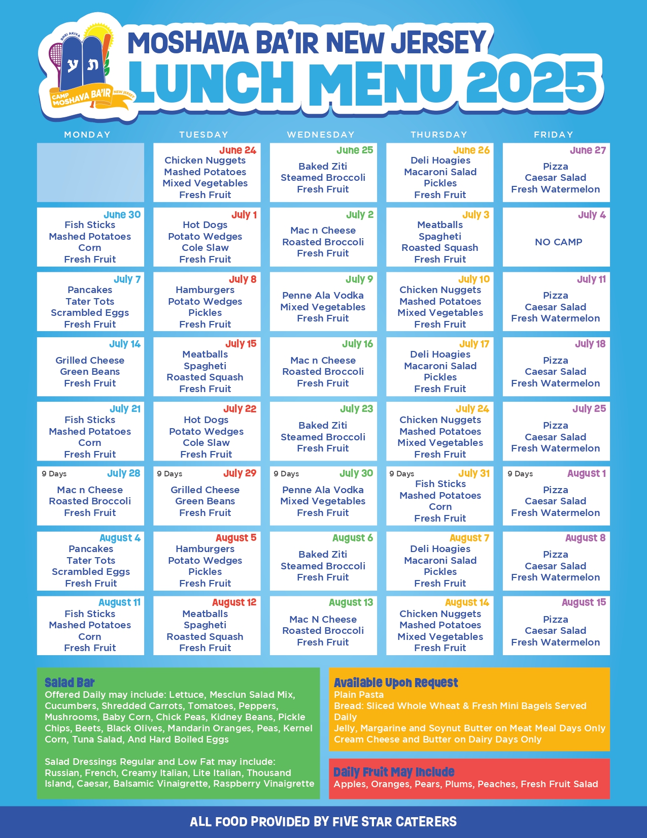 Lunch is available for $42.50 a week. Five Star Caterers is our lunch provider.